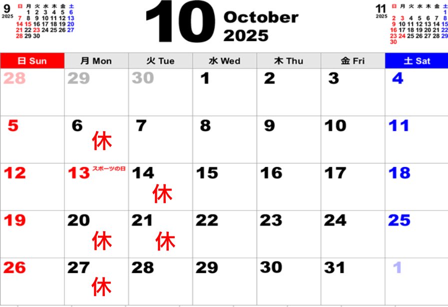 9月は15日(月)が敬老の日、23日(火)が秋分の日となりますので、お休みが変則的になってます。ということで、秋分の日の週は休まず営業しますので、月末の29日(月)、30日(火)を連休とさせていただきます。