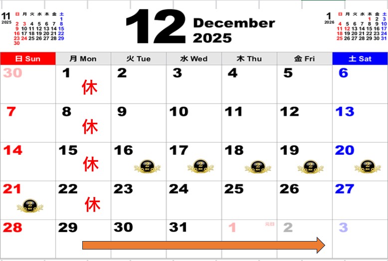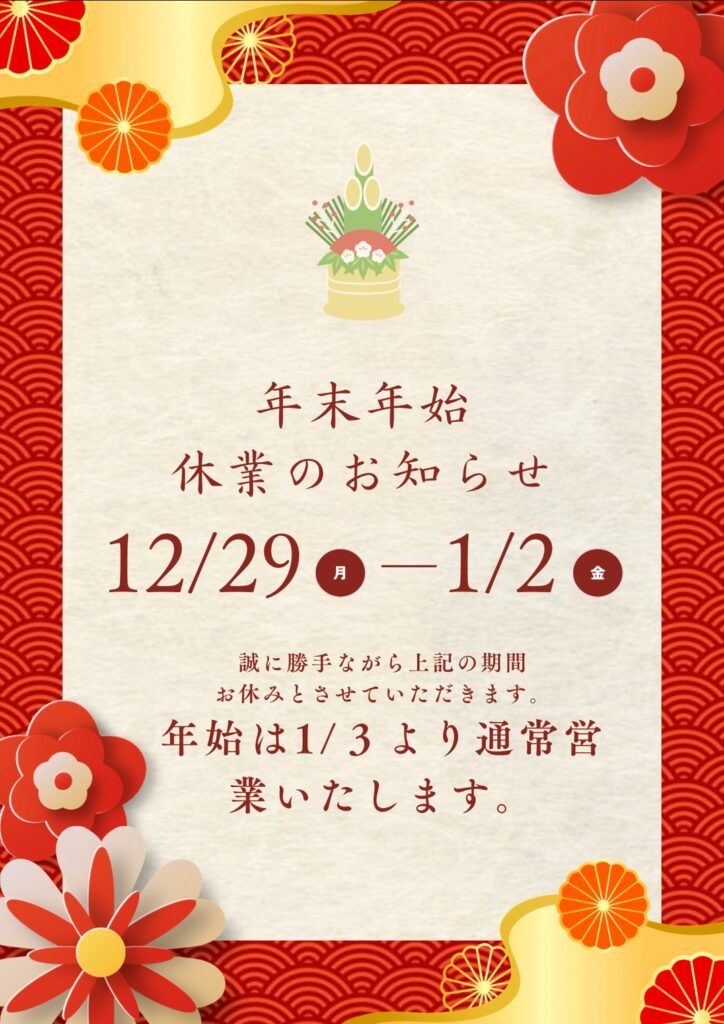 年末年始は、12月29日~1月2日を正月休みとさせていただきます。みなさんも、良いお年をお迎えくださいませ。